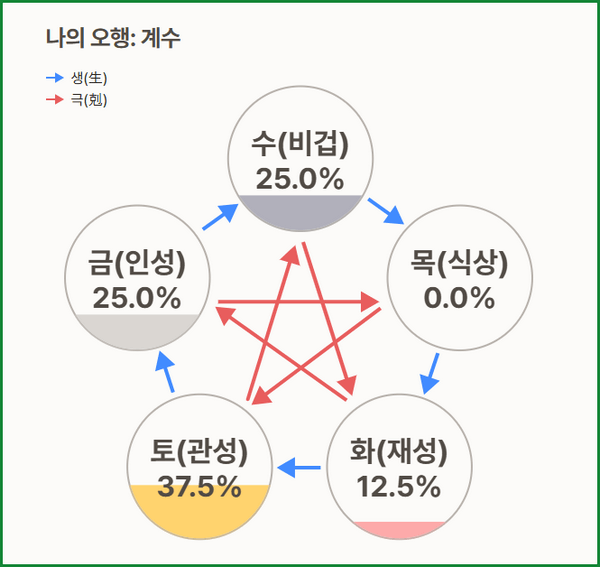 | 목(木) | 성장, 추진력, 목표지향적 | 목표 지향적이고 성취 욕구가 강합니다. 🌱 |