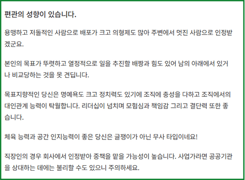- 관계 개선: 타인의 성향을 이해하고 원활한 소통 방법을 찾을 수 있습니다.